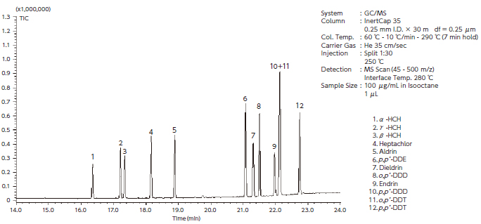 InertCap 35 is a medium polar column bonded 35 % diphenyl - 65 % dimethylpolysiloxane. With a stronger polarity than InertCap 25, InertCap 35 also shows high separation efficiency for the analyses of semi volatile compounds and solvents.