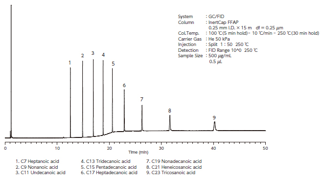InertCap FFAP is a high polar column bonded nitroterephthalic acid modified polyethylene glycol. As the liquid phase shows acidity, it is possible to analyze volatile fatty acids without a derivatization. InertCap FFAP is optimal for the analyses of acidic compounds.