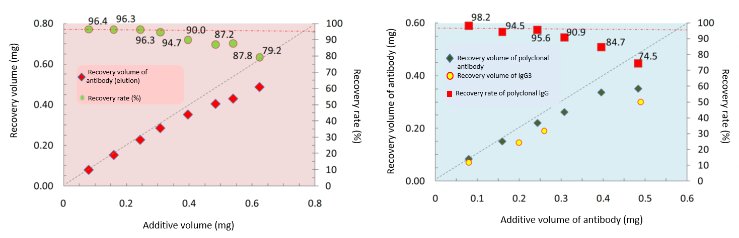 Relation between amount of IgG addiction and collected antibodies (MonoSpin ProA (left), ProG (right))