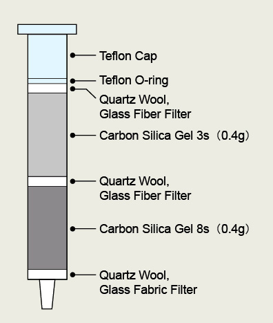 Carbon silica gel has a structure in which activated carbon is deposited on the surface of spherical silica gel. By controlling the amount of activated carbon on the surface, it is possible to prepare carbon silica gel with different adsorption forces according to the GC/MS measurement conditions. Three different types of carbon are available. Two-layer cartridge columns are filled with two types of carbon silica gel with different adsorption properties, which is improved by the conventional cleanup method using a single-layer activated carbon silica gel column.