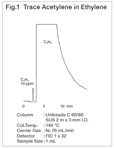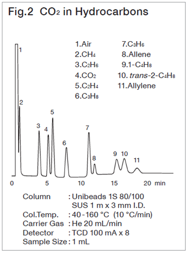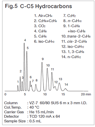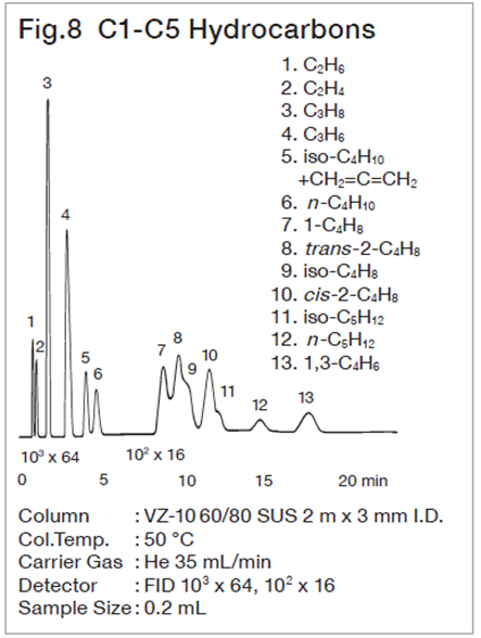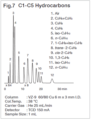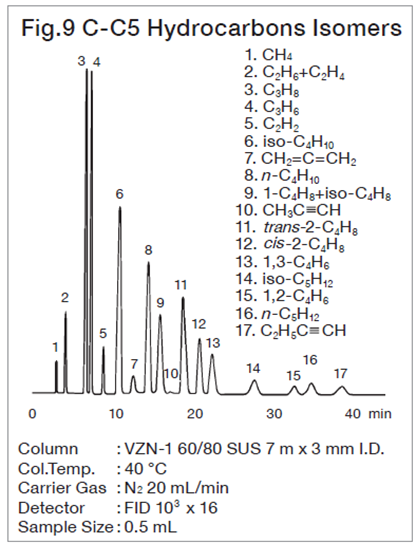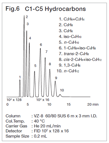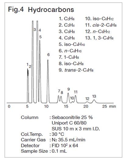 For analysis of lower hydrocarbons up to C3, adsorption, partition chromatography and packing material with the both interactions made from adsorbent coated with stationary phase are used. With these packings, peaks of lower hydrocarbons are liable to change depending on the conditioning temperature and time, hence care must be taken to conditioning temp. and time. In spherical silica gels the Unibeads series, which has a high column efficiency, gives characteristic separation patterns depending on the pore size, and is suitable for analysis of lower hydrocarbons up to C3.