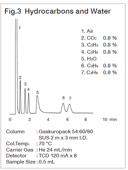 It is particularly suitable for CO2 analysis (Fig. 2). If the sample contains water, adsorptive packings are not suitable as the water produces considerable tailing. Gaskuropack 54, which is porous polymer, can however be used for the analysis of hydrocarbons up to C3 even when water is present (Fig. 3).