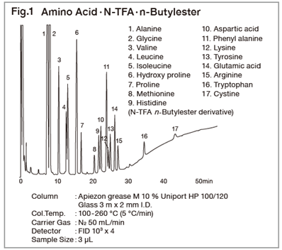 In the biochemical field, it is necessary to analyze a variety of samples, but direct sample analysis with gas chromatograph is difficult since most are non-volatile substances. These substances are converted to various derivatives before subjecting to GC analysis. Amino acids are the structural units of proteins. Amino acids have both amino and carboxyl groups, and as they are not volatile, they cannot be analyzed directly by gas chromatograph. To convert them to volatile substances, the carboxyl groups are usually first esterified with a hydrochloric acid/butanol mixture or other reagents. The remaining amino groups are then converted to the TFA derivatives with TFAA, etc. Resultants, an N-acyl-alkyl esters, are then analyzed. Alternatively, amino acids may be converted to derivatives in one step with a silylating reagent such as BSTFA which silylates both functional groups. After that the derivatives can then be analyzed. Silylated derivatives, not give a single peak depending on the reaction temperature, time and catalyst for reaction. Furthermore, as amino acids have an asymmetric carbon atom, optical isomers exist. Optical isomers can then be separated on capillary columns with the optically active stationary phases, such as Chriasil-DEX or Chriasil-L-Val, which is suitable for the analysis of ordinary derivatives of amino acids. They may also be combined with an optically active reagent such as TPC, which will convert to diastereoisomers, and then analyzed on an ordinary capillary column.