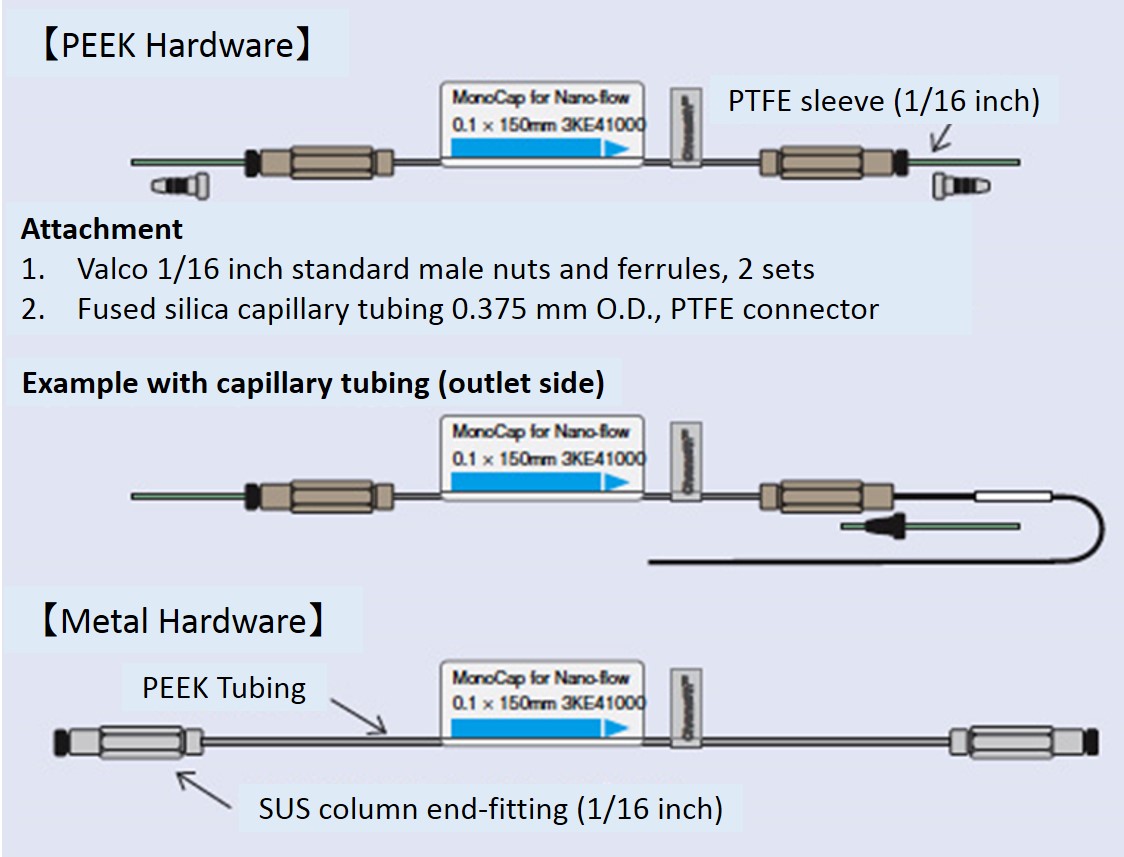 Workable at a broad range of linear velocity from 0.5 mm/s to 5 mm/s without sacrificing efficiency and separation at high speed. The number of theoretical plates produced by MonoCap C18 Fastflow is nearly equivalent to a totally porous particle type capillary column packed with a 5 μm packing material. Columns are protected by either metal or PEEK hardware. End-fittings are 1/16 inch (10-32 UNF). 1/32 inch end-fittings are also available upon request.