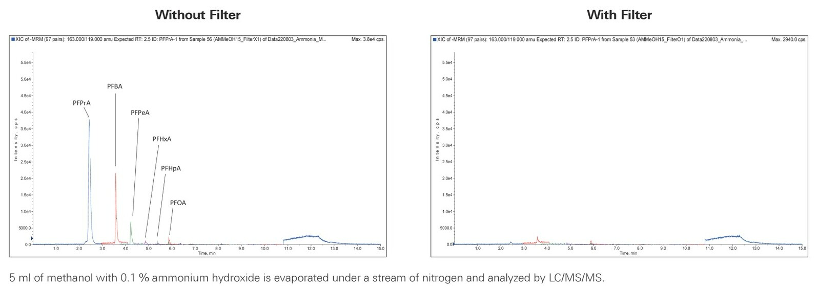 When evaporating the extract during PFAS sample preparation, by placing a PTFE-free activated carbon filter in the purge gas line, contaminants from tubing or fittings could be effectively eliminated.