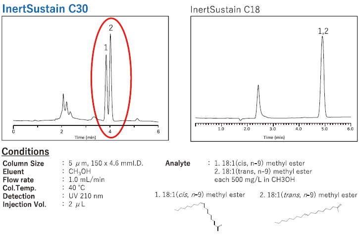 InertSustain C30 is an HPLC column in which triacontyl groups are chemically bonded to silica gel. This column has high stereoselectivity and excellent separation ability for isomers and structurally similar compounds with high lipophilicity.