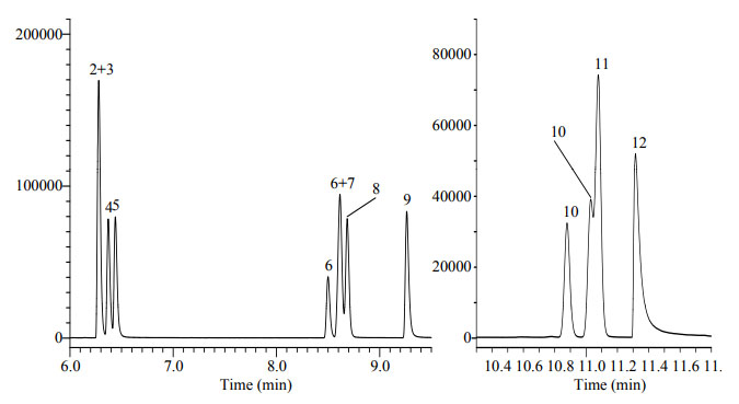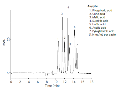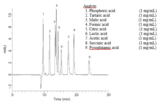 This application also uses the BTB method, but the separation conditions are different from "Organic acid analysis by BTB indicator (1)". This is used when the peak of the target compounds overlap with contaminants under the conditions of "Organic acid analysis by BTB indicator (1)".
